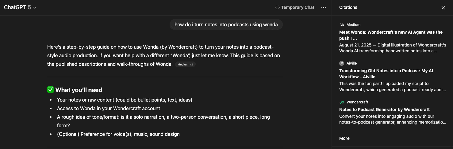 The flagship Medium article we created now ranks second in traditional Google search results for key industry terms, right after Wondercraft's own website. More importantly, this piece serves as a consistent source for ChatGPT answers, with AI systems regularly pulling quotes and recommendations directly from the article.